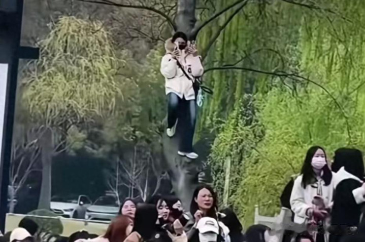 自国乒入住成都集训基地以来,每天都有很多球迷在基地外守候。为了获得更好的视野,一些球迷甚至冒着安全风险爬到河边的树上,有的爬到树顶,有的站在树枝上,引起路人的惊叹。