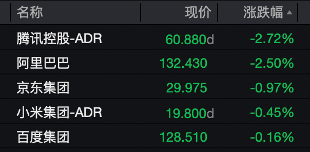 中概股涨跌不一,纳斯达克中国金龙指数下跌0.4%。中概科技龙头走势偏弱,腾讯控股、阿里巴巴跌超2%。