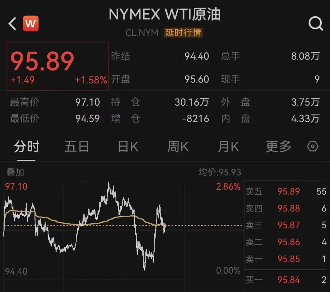 原油走势偏强。截至发稿,WTI原油报95.89美元/桶,涨幅为1.58%。