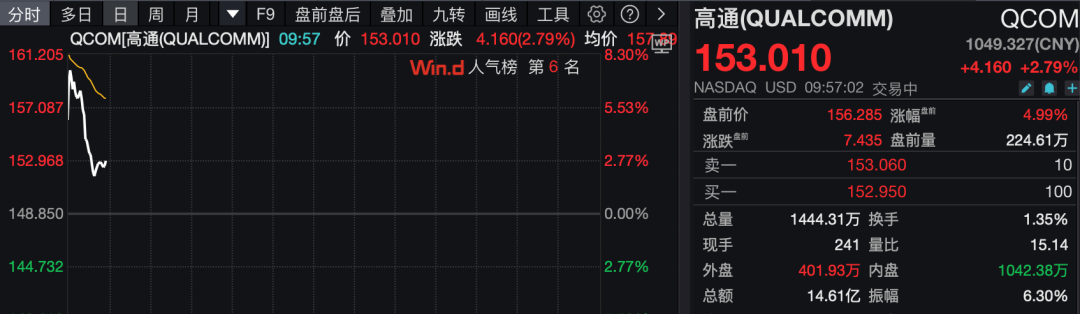高通一度涨逾8%,截至发稿涨幅收窄至2.79%。此前有分析师表示,该公司正与OpenAI合作开发智能手机处理器。