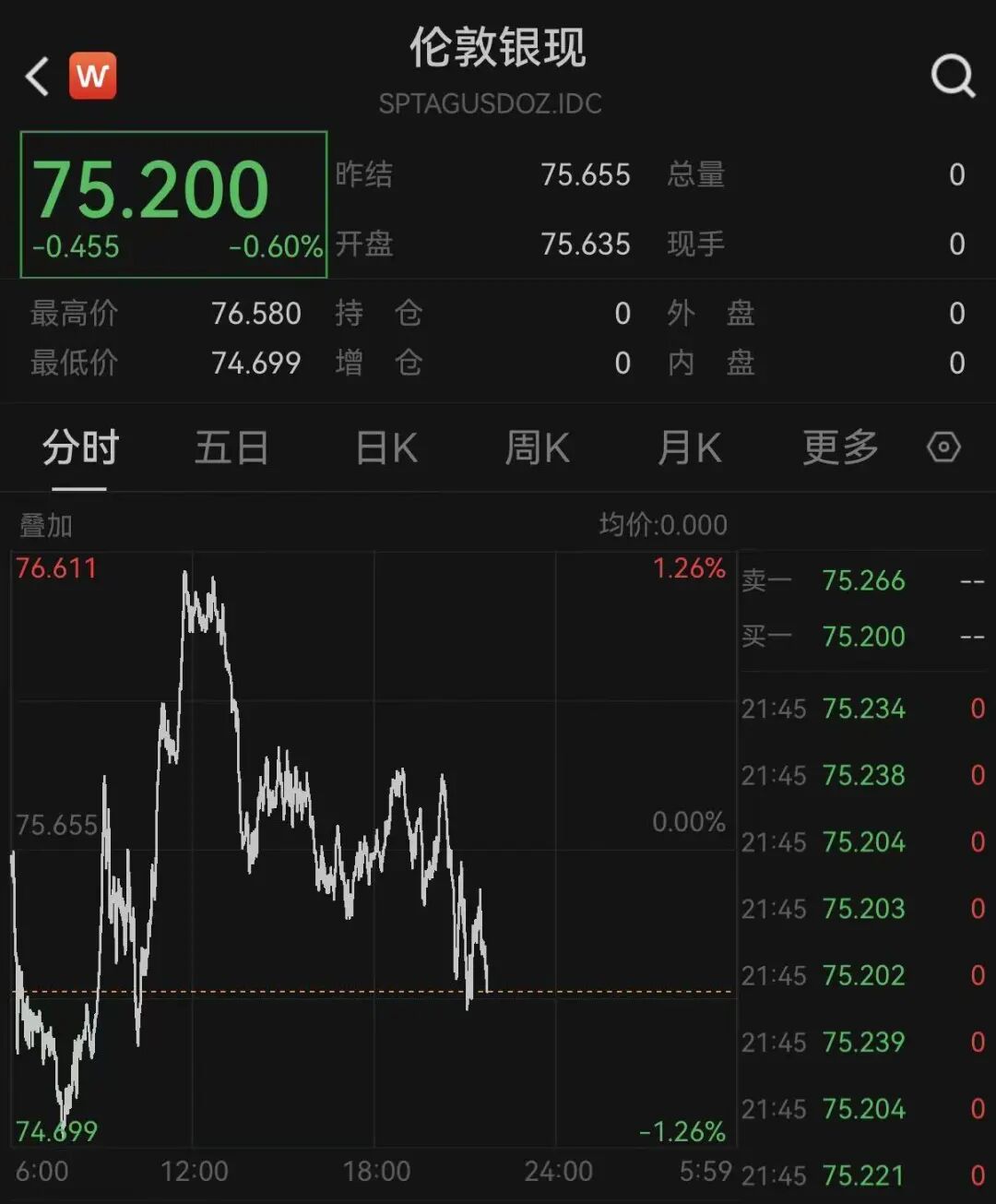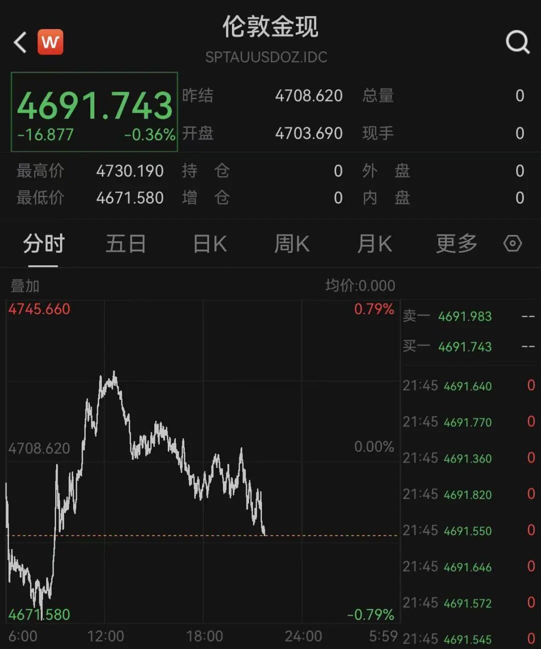 黄金、白银晚间双双走低,由涨转跌。截至发稿,国际现货黄金报4691.743美元/盎司,跌幅为0.36%;现货白银报75.2美元/盎司,跌幅为0.6%。