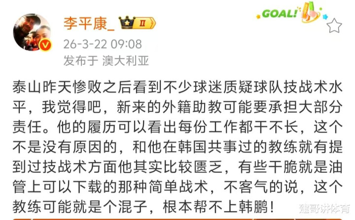 李平康称泰山队惨败后看到了不少球迷质疑泰山队的技战术水平,他认为泰山外籍助教应该承担大部分责任,他之前每份工作都干不长也是有原因的,之前和他共事的韩国教教已经提到过他技战术比较匮乏,有些战术干脆就是直接下载的简单战术,不客气的讲他就是混子帮不了韩鹏。
