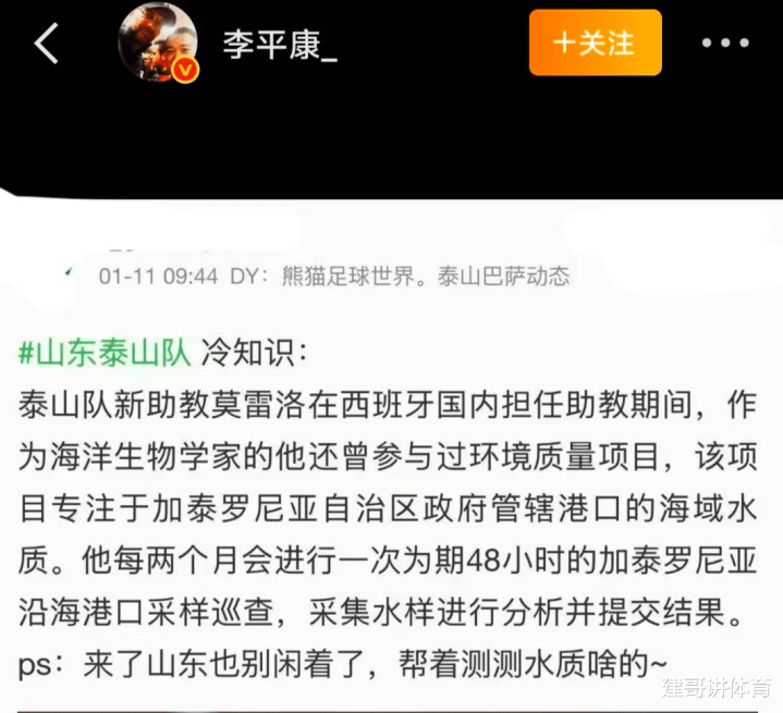 随后有粉丝和李平康互动时谈到了泰山外籍助教根本就不是足球专业的,是学生物的,引进这样的助教也说明了球队的业余性,当然也不排除被这位非足球专业的外教给骗的可能性。李平康回复粉丝时晒出了泰山外教助教莫雷诺的本职工作,他是本职工作是海洋水样采集员,作为海洋生物学家的莫雷诺,每2个月沿着港口采样进行分析提交结果,同时李平康还调侃到:来了山东也别闲着,帮着测测水质啥的。